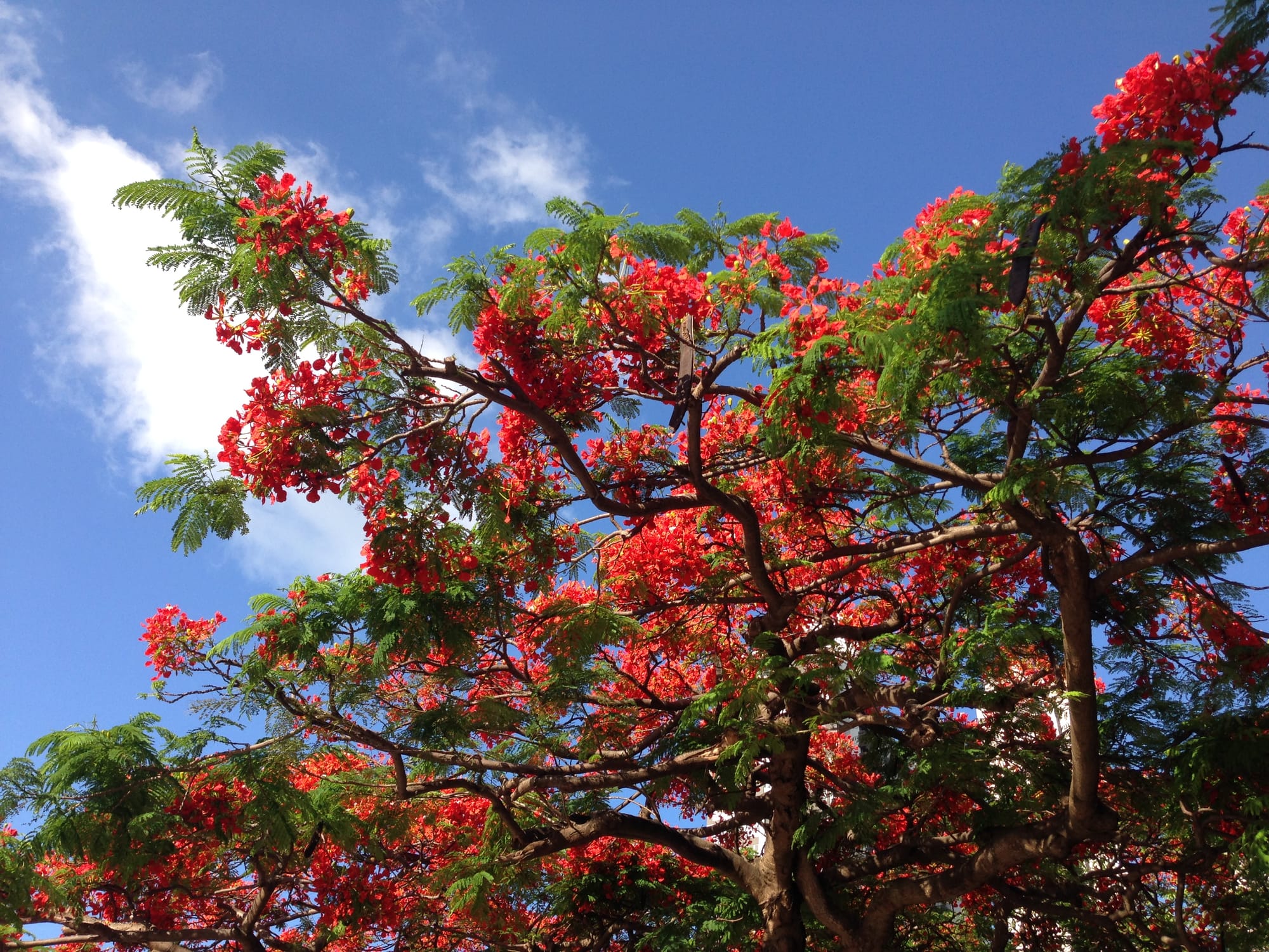There are also two lovely non-heritage flame of the forest trees (Delonix regia) with boughs that (rather unusually) bend and sweep the ground. When in bloom, the flame of the forest is incomparable. Their bright orange-crimson flowers are so vibrant; once you see them in person, you understand immediately how it received its common name. But even without the flowers, its feathery compound leaves and umbrella-shaped crown make it a delight to the eye.